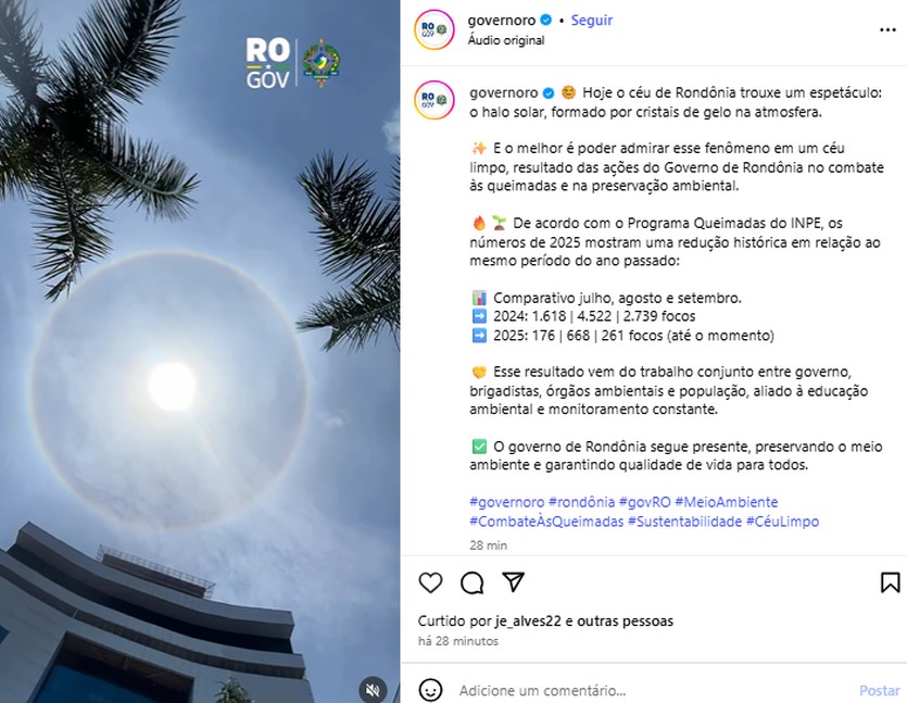 O Governo de Rondônia também se manifestou nas redes sociais sobre o halo solar, aproveitando para comemorar os resultados do monitoramento das queimadas. Dados do Programa Queimadas do INPE apontam que os meses de julho, agosto e setembro de 2025 registraram uma queda histórica de focos de incêndio em relação ao mesmo período do ano anterior: