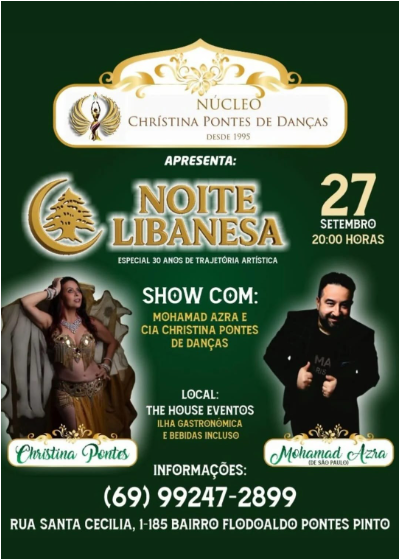 Já que o assunto é festa, a cultura árabe será celebrada na noite deste sábado (27), com a “Noite Libanesa”, no The House Eventos, localizado na rua Santa Cecília, 1-185, bairro Flodoaldo Pontes Pinto. A organização é do Núcleo Christina Pontes de Danças que existe em Rondônia desde 1995. Quinze dançarinas de danças árabes estarão abrilhantando a festa que terá também a participação do cantor Mohamed Azra. Ele nasceu em Damasco, seu pai é sírio e a mãe libanesa, vindo para o Brasil em 2000, se estabelecendo em São Paulo, onde divulga a música e a dança árabes. Além disso terá também um cardápio que mistura sabores regionais com as delícias da gastronomia árabe. Mais informações podem ser obtidas com a equipe do Núcleo Christina Pontes de Danças pelo telefone 69 99247-2899; pelo Instagram @Christinapontesoficial ou pelo Facebook Christina Pontes.