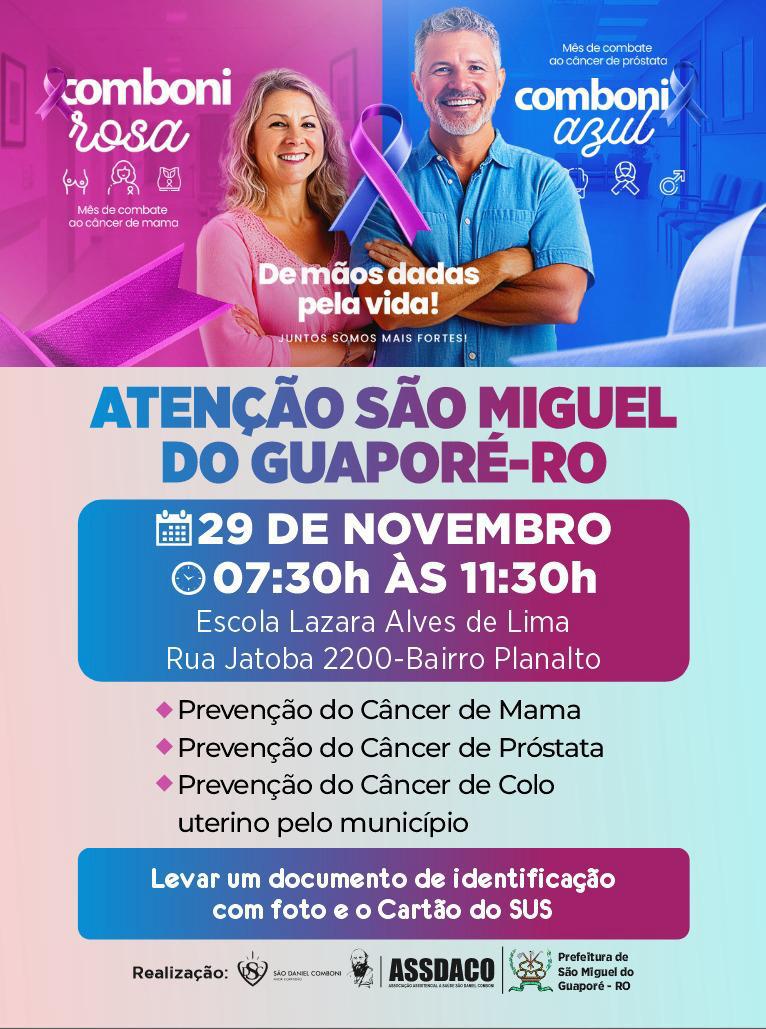 Mais uma mobilização voltada à prevenção ao câncer e ao fortalecimento dos cuidados com a saúde acontece no final deste mês, dia 29 de novembro, em São Miguel do Guaporé (RO). A ação integra as campanhas Comboni Rosa e Comboni Azul, realizadas pela Associação Assistencial à Saúde São Daniel Comboni (ASSDACO) e dedicadas à prevenção aos cânceres de mama, próstata e colo do útero.