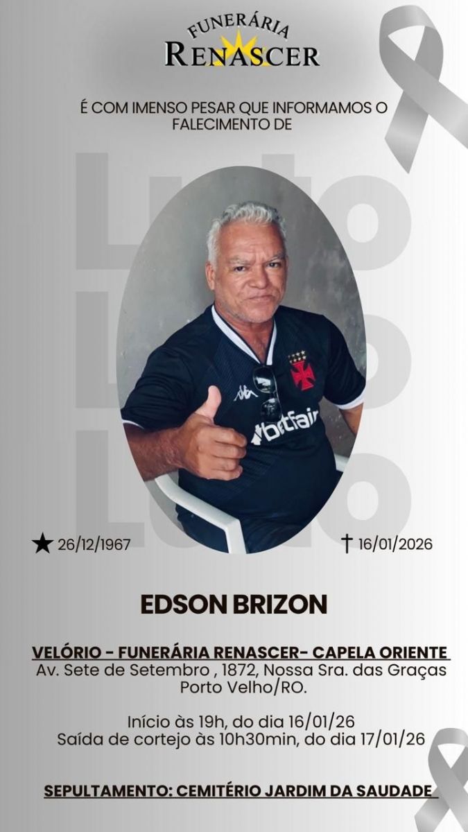 É com profundo pesar que comunicamos o falecimento de Edson Brizon, Policial Militar, ocorrido em 16 de janeiro de 2026, em Porto Velho – RO, por causas naturais.