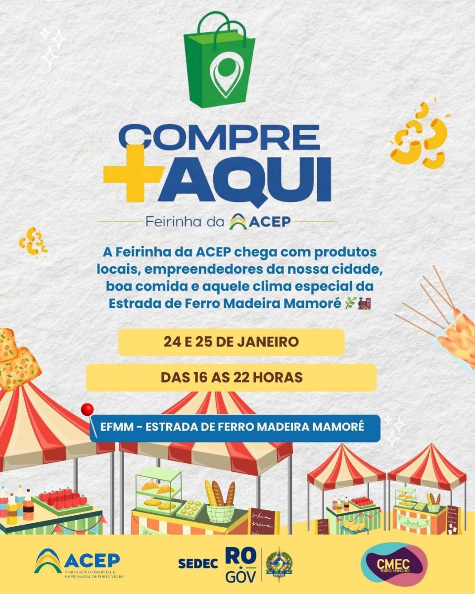 No aniversário de Porto Velho, empreendedores locais estarão reunidos na praça da Estrada de Ferro Madeira-Mamoré oferecendo uma ampla variedade de produtos regionais e de fabricação local durante a Feira Compra Mais Aqui, promovida pela Associação Comercial e Empresarial de Porto Velho (ACEP). O evento acontece nos dias 24 e 25 de janeiro, das 16h às 22h, e integra a programação comemorativa da capital.