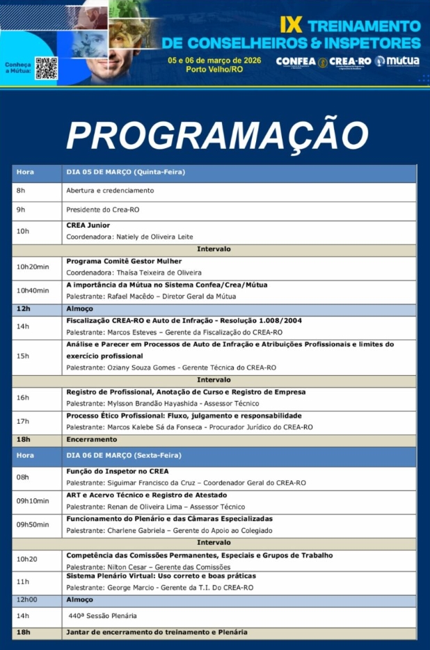 A programação foi cuidadosamente planejada para proporcionar aos participantes um entendimento aprofundado sobre processos, diretrizes atualizadas e boas práticas relacionadas à fiscalização e à atuação profissional. Além disso, a Mútua-RO estará presente prestando atendimento aos participantes, esclarecendo dúvidas e apresentando informações sobre benefícios, produtos e serviços disponibilizados aos associados.