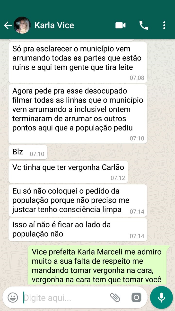 Veja o trecho da conversa: "Vice prefeita Karla Marceli me admiro muito a sua falta de respeito me mandando tomar vergonha na cara. Vergonha na cara tem que tomar você e esse prefeito que foram encascalhar um trecho de 100 metros do asfalto até a frente da porteira da fazenda onde você mora”, rebateu.