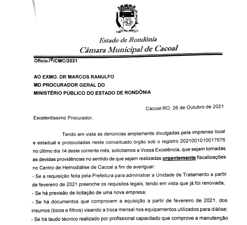 Seis dos 12 vereadores de Cacoal assinaram um ofício dirigido ao procurador-geral de Justiça do Ministério Público Estadual (MPE), Ivanildo de Oliveira, para que o órgão faça fiscalizações no Centro de Hemodiálise da cidade, que foi assumido no mês de fevereiro deste ano pela Prefeitura comandada por Adailton Fúria (PSD).