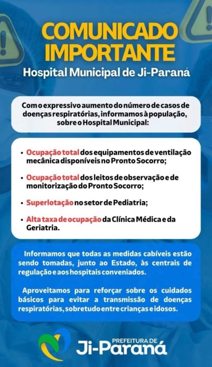 Ontem, dois adultos foram intubados e transferidos para UTI com sintomas gripais. Parte dos pacientes atendidos pode, e tem, desenvolvido pneumonia. “Hoje ainda não tivemos nenhuma [intubação], graças a Deus”. A Prefeitura de Ji-Paraná tem atuado para a gestão da crise aumentando o contingente de médicos, tanto nas UPAs quanto no Hospital Municipal.