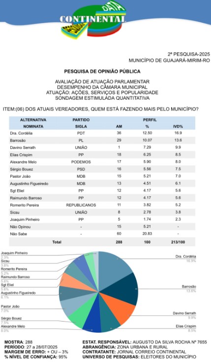 Em uma nova sondagem realizada entre os dias 27 e 28 de julho de 2025, a Data Continental divulgou sua 2ª Pesquisa de Opinião Pública, focada na avaliação da atuação parlamentar e no desempenho da Câmara Municipal de Guajará-Mirim, em Rondônia.