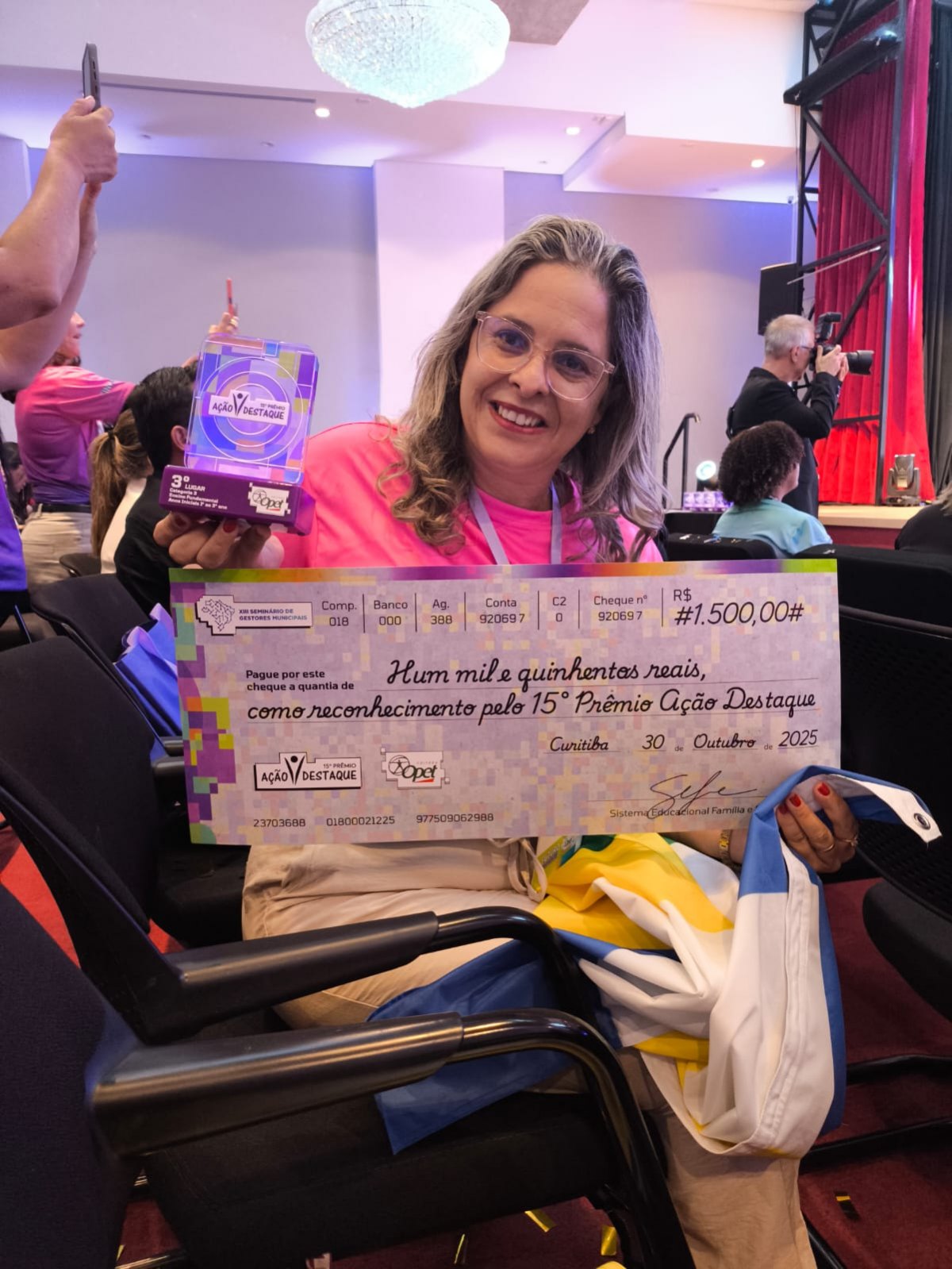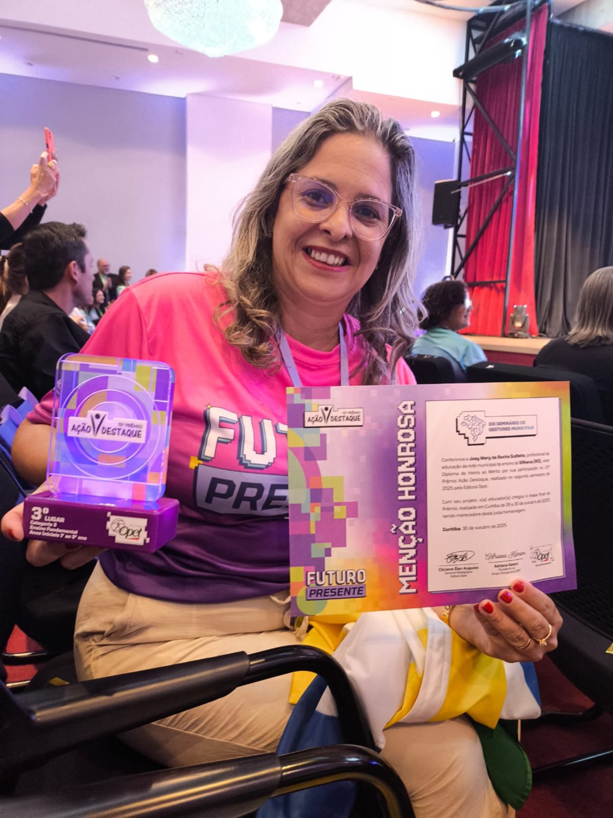 O documentário “Vilhena: Minha Cidade Tem História”, produzido pela Escola Municipal Felipe Rocha de Lima, conquistou o 3º lugar nacional no 15º Prêmio Ação Destaque 2025, promovido pela Editora Opet. A premiação aconteceu nesta quinta-feira (30), durante o XIII Seminário de Gestores Municipais, realizado em Curitiba (PR).
