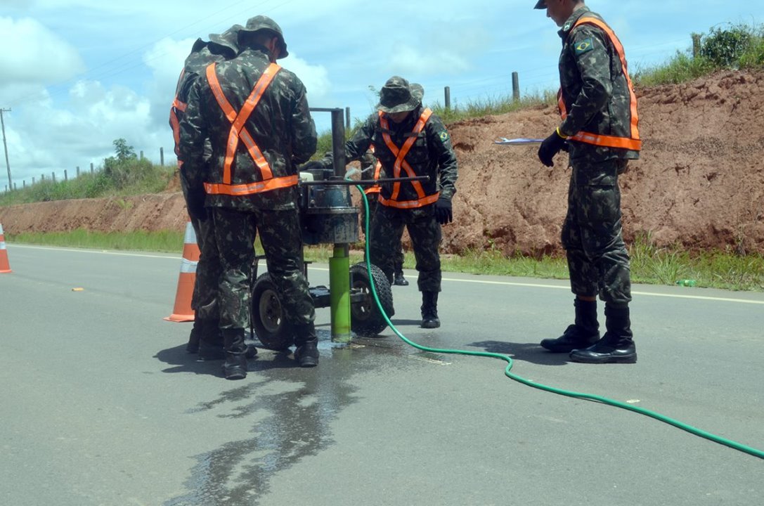 As amostras da capa asfáltica são retiradas com a ajuda de uma sonda extratora do 5º BEC, catalogadas e devidamente identificadas conforme o trecho. Posteriormente, é feito um trabalho de recomposição dos pequenos furos, pela equipe do Departamento de Estradas de Rodagem (DER), que dá suporte à ação do TCE/Exército.