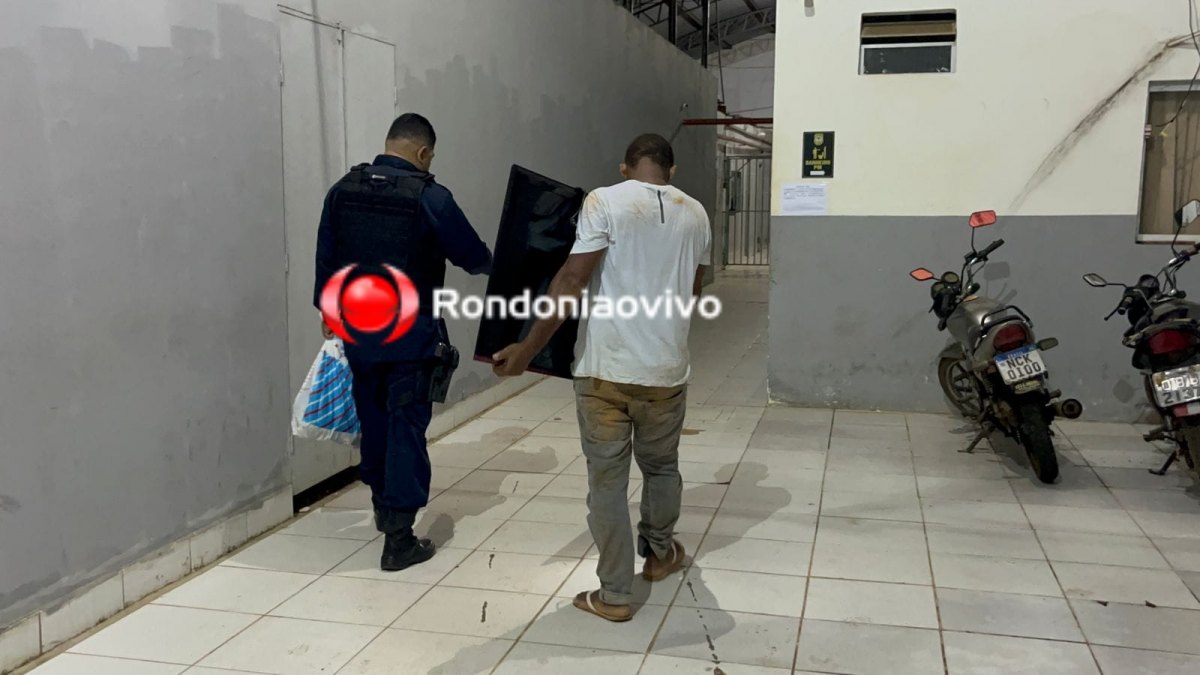 Os policiais militares do setor 14 do 5° Batalhão em patrulhamento pela região abordaram o criminoso que já estava fugindo com uma televisão.