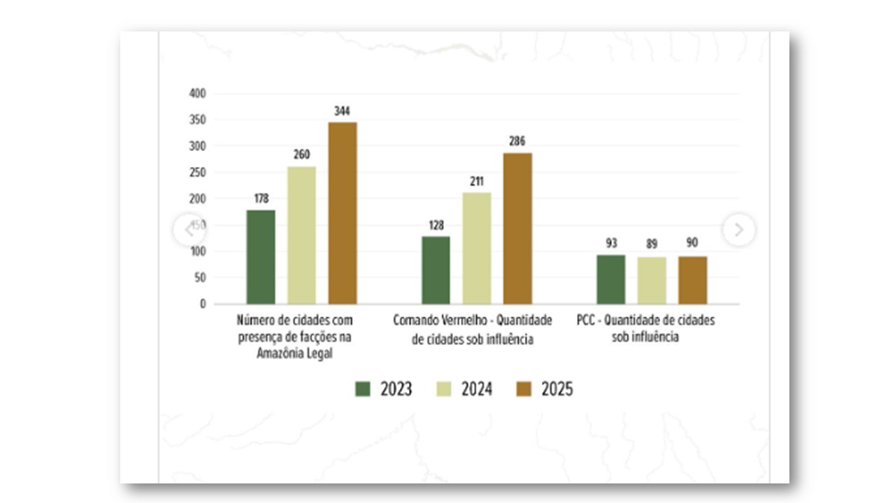 O relatório destaca a hegemonia do Comando Vermelho (CV) entre as facções atuantes na região. De acordo com a análise mais recente, dos 176 municípios com domínio de uma única facção, 130 são controlados pelo CV, seguidos pelo Primeiro Comando da Capital (PCC) em 28 deles.