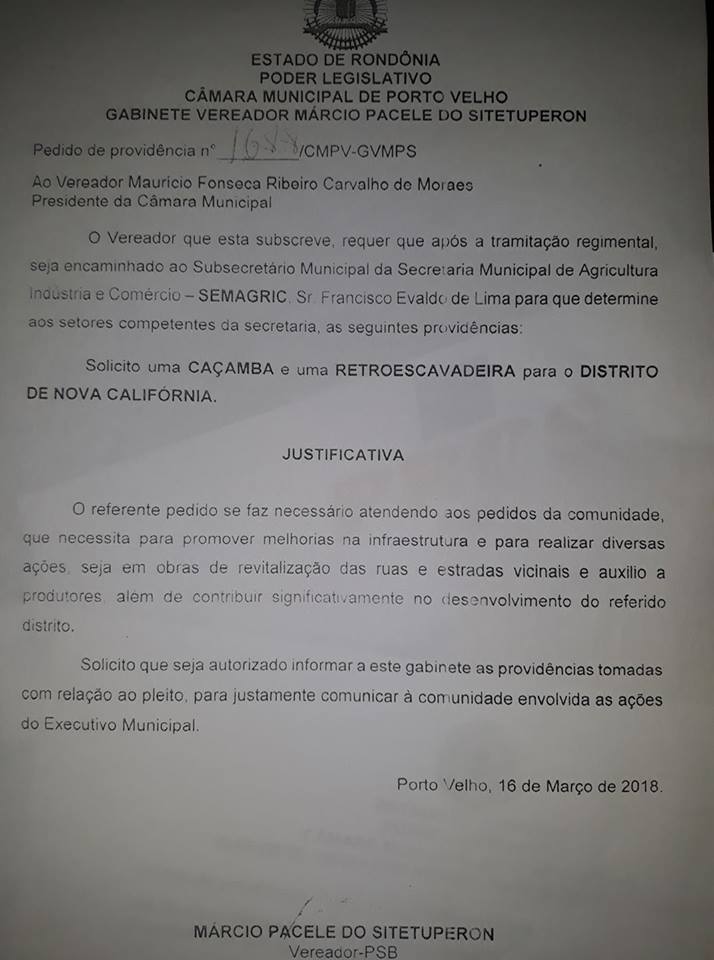 Uma retroescavadeira e um caçamba para atender aos produtores rurais e a recuperação de ruas e vicinais do distrito de Nova Califórnia. Esse é uma das mais novas conquistas do vereador Márcio Pacele do Sitetuperon em favor das comunidades da região da Ponta do Abunã. As máquinas já estão trabalhando no distrito desde o início do mês de maio.
