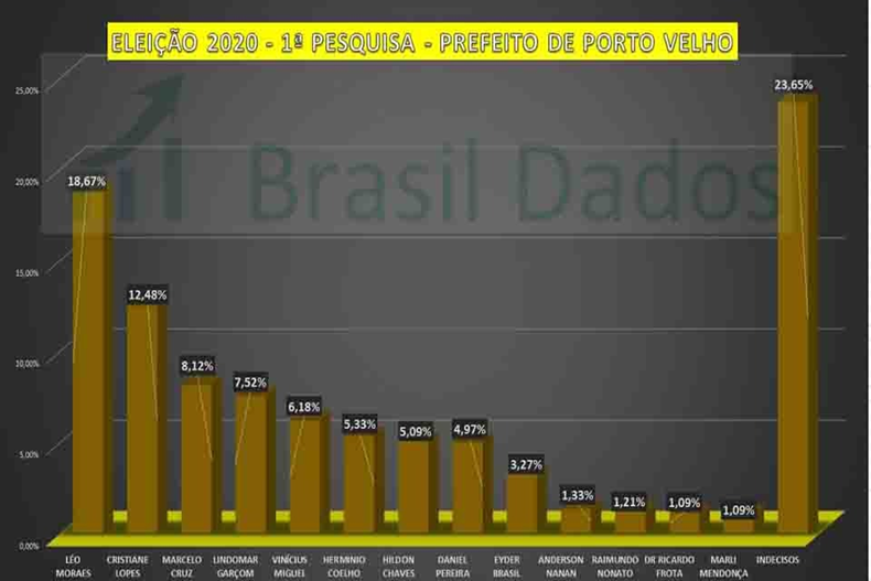 De acordo com o instituto Brasil Dados, três nomes largam na frente na intenção de voto do portovelhense, na primeira colocação o deputado federal Léo Moraes, com 18,67%; seguido pela vereadora Cristiane Lopes, com 12,48%; e pelo deputado estadual Marcelo Cruz, com 8,12%.