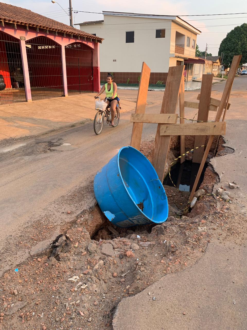 Um buraco enorme está aberto no meio da via causando transtornos aos motoristas que transitam por ali