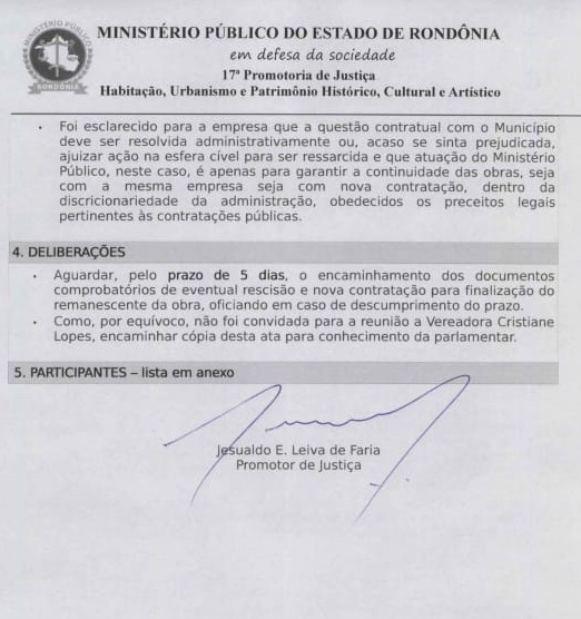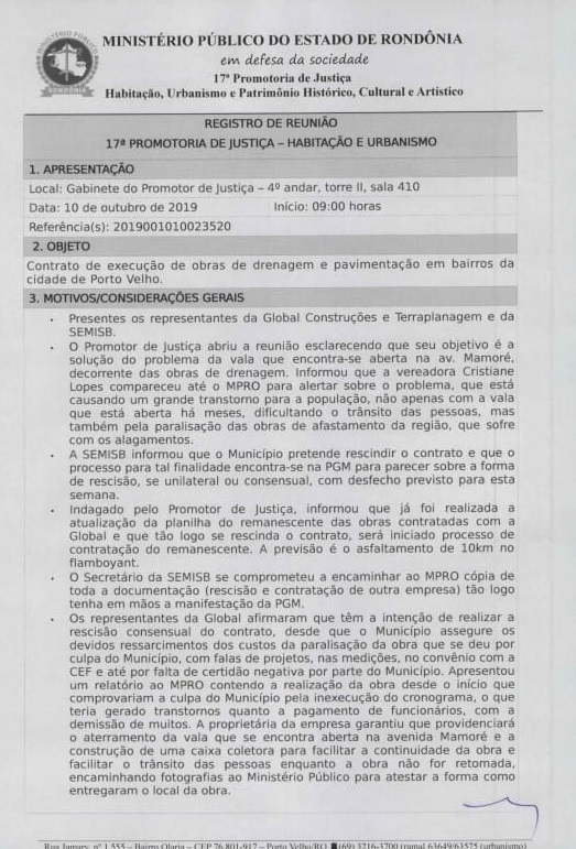 Sobre as ações da vereadora com relação às obras de pavimentação do bairro Flamboyant, ela mostrou um dos primeiros Pedidos de Providências solicitando drenagem com posterior pavimentação asfáltica para diversas ruas, realizado em 2017, em seu primeiro ano de mandato. Além disso, Cristiane Lopes, comprovou a realização de reuniões com a empresa responsável pelas obras anteriormente, com os moradores, idas ao Ministério Público Estadual (MP/RO) e a realização de uma Audiência Pública ocorrida em junho de 2019, para que a Secretaria Municipal de Infraestrutura e Serviços Básicos (SEMISB) e a empresa prestassem contas de todo o serviço realizado e o que ainda faltava para a conclusão das obras, sem contar a mais recente fiscalização à secretaria, na manhã de ontem (11), para saber quando as obras serão retomadas. "Tenho toda a documentação que comprova a nossa luta pelo bairro Flamboyant. Não estou falando da boca pra fora. Tenho orgulho de dizer e mostrar que estou trabalhando pelo bairro. Não vou desistir de continuar em busca de benefícios para nossa população, apenas porque sou oposição ao prefeito. Sou e sempre serei a favor dos portovelhenses", ressaltou.