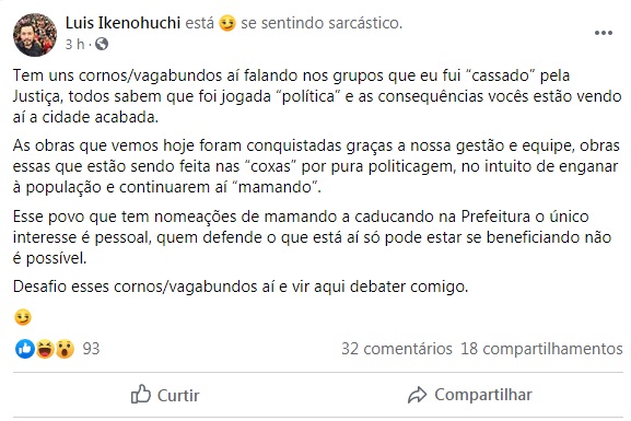 “Tem uns cornos/vagabundos aí falando nos grupos que eu fui “cassado” pela Justiça, todos sabem que foi jogada “política” e as consequências vocês estão vendo aí a cidade acabada”, escreveu Luís Ikenohuchi.