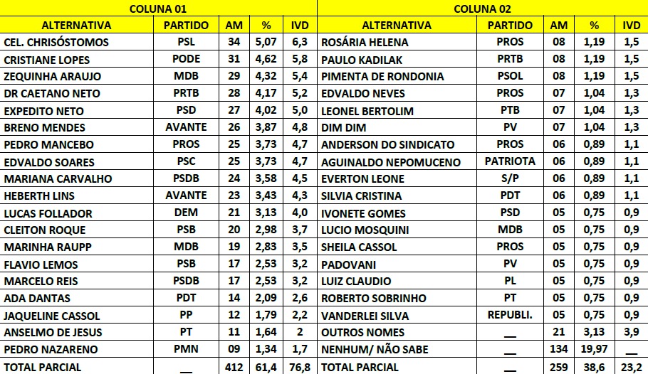 Outros nomes da pesquisa: Breno Mendes (Avante) com 4,8%; Pedro Mancebo e Edvaldo Soares, empatados com 4,7%; XXXXXX XXXXXXXX (4,5%); Herbert Lins (4,3%); Lucas Folador (4%); Cleyton Roque (3,7%); Marinha Raupp (3,5%); além de Flávio Lemoes e Marcelo Reis, empatados com 3,2%.