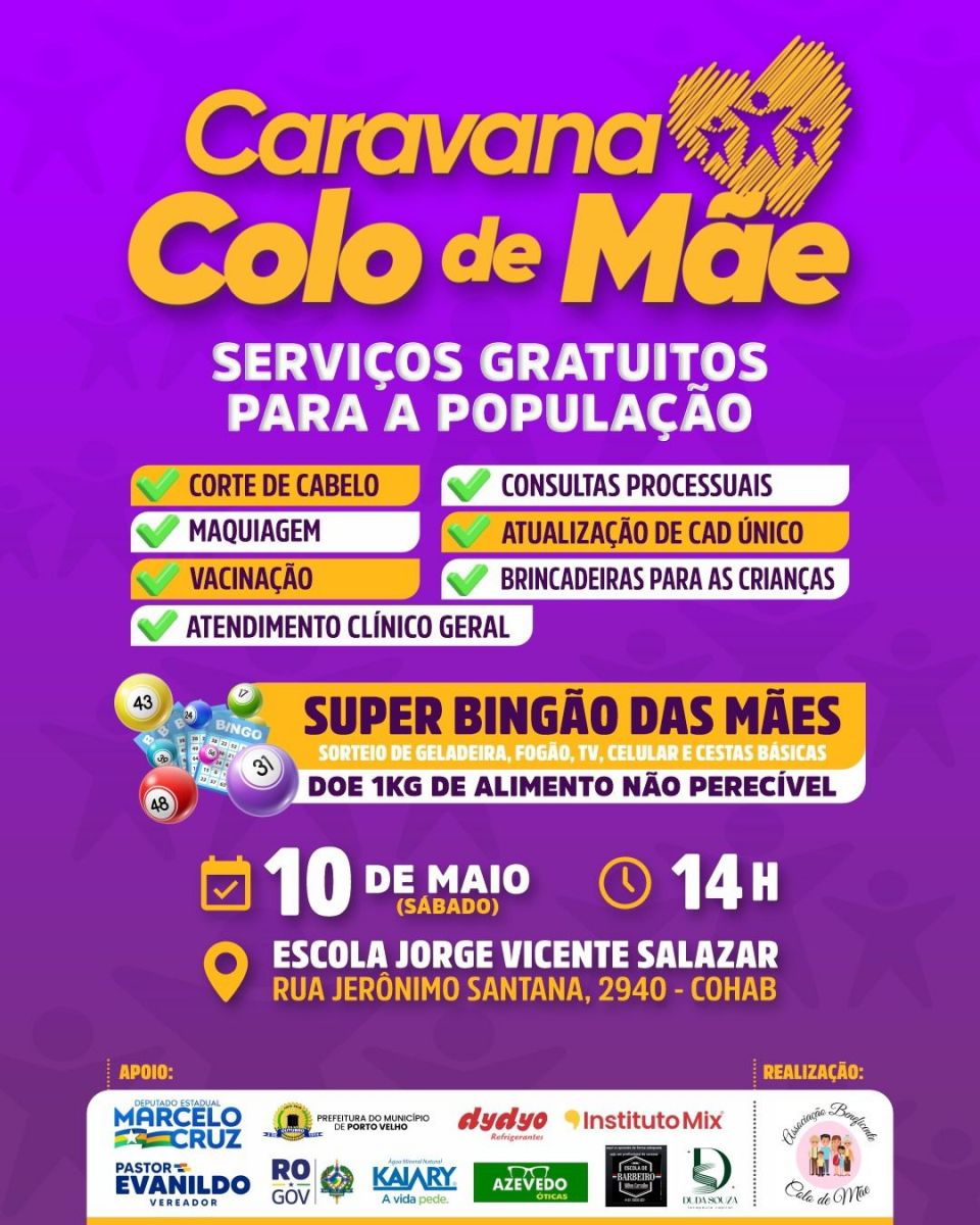 Com apoio do deputado estadual Marcelo Cruz e do vereador Pastor Evanildo, além da Prefeitura de Porto Velho e diversos parceiros da iniciativa privada, a Caravana vai oferecer uma série de serviços gratuitos à comunidade, incluindo corte de cabelo, maquiagem, vacinação, atendimento clínico geral, consultas processuais, atualização do CadÚnico e muitas brincadeiras para as crianças. Tudo isso em um só lugar, acessível para todos e pensado com carinho especialmente para as mães.