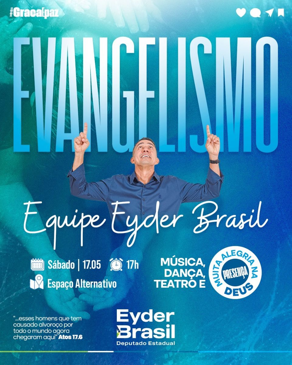 Neste sábado, 17 de maio, a partir das 17h, o deputado estadual Eyder Brasil realiza a primeira edição de um grande evento de evangelismo no Espaço Alternativo, em Porto Velho. A programação conta com música, teatro, dança e momentos de oração, em um ambiente de fé, comunhão e esperança.