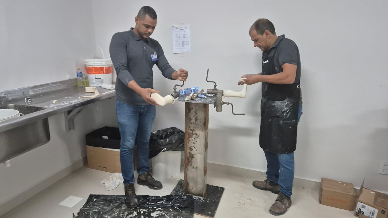 Adalto Nunes do Nascimento Tavares, técnico ortopédico e responsável pela oficina, explicou que profissionais de Barretos estão integrados ao trabalho neste momento, reforçando a equipe.
