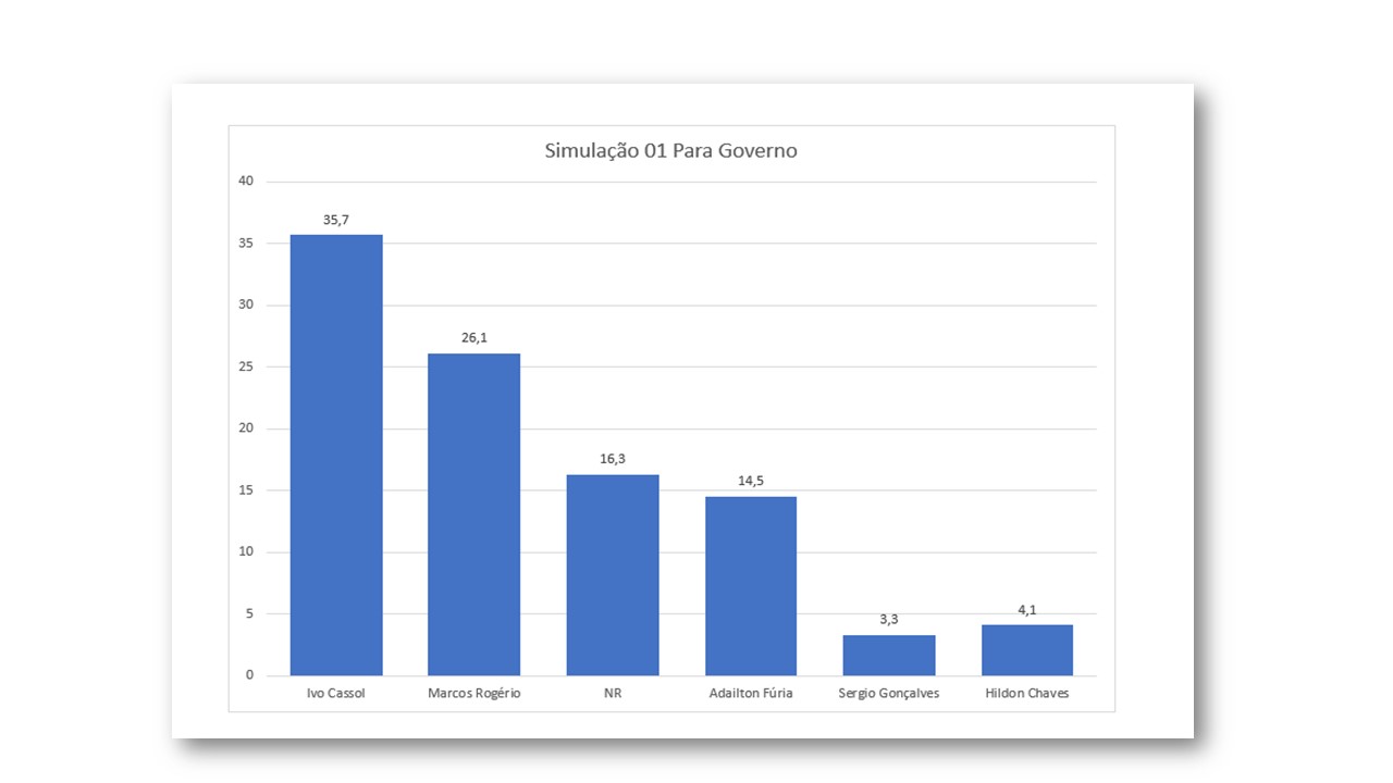 Um dos dados que chamou a atenção foi a grande liderança de Ivo Cassol que apareceu com 35,7% das intenções de votos, na primeira simulação tendo como concorrentes o atual senador Marcos Rogério (26,1%), o prefeito de Cacoal Adailton Fúria (14,5%), o ex-prefeito de Porto Velho Hildon Chaves (4,1%) e o atual vice-governador Sérgio Gonçalves (3,3%).