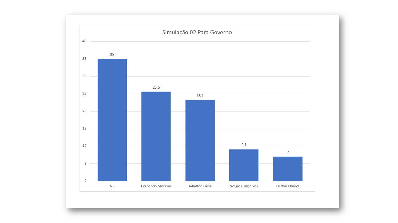 Outra simulação para a disputa de governador do Estado sondou os nomes dos pré-candidatos Fernando Máximo (15,6%), Adailton Fúria (23,2%), Sérgio Gonçalves (9,1) e Hildon Chaves (7%). Nesse cenário, os votos de Ivo Cassol e Marcos Rogério foram pulverizados em todas as outras candidaturas, elevando os percentuais de votos.