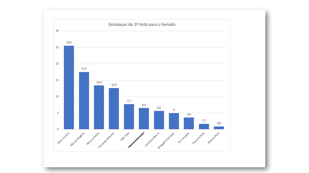 Na simulação de primeiro voto para senador, Sílvia Cristina (PP) apareceu como favorita com 25,5% das intenções, seguida por Marcos Rogério (PL) com 17,5% das intenções de votos. Como a margem de erro da pesquisa é de dois pontos percentuais, Sílvia e Rogéria apareceram como favoritos nesse cenário eleitoral.