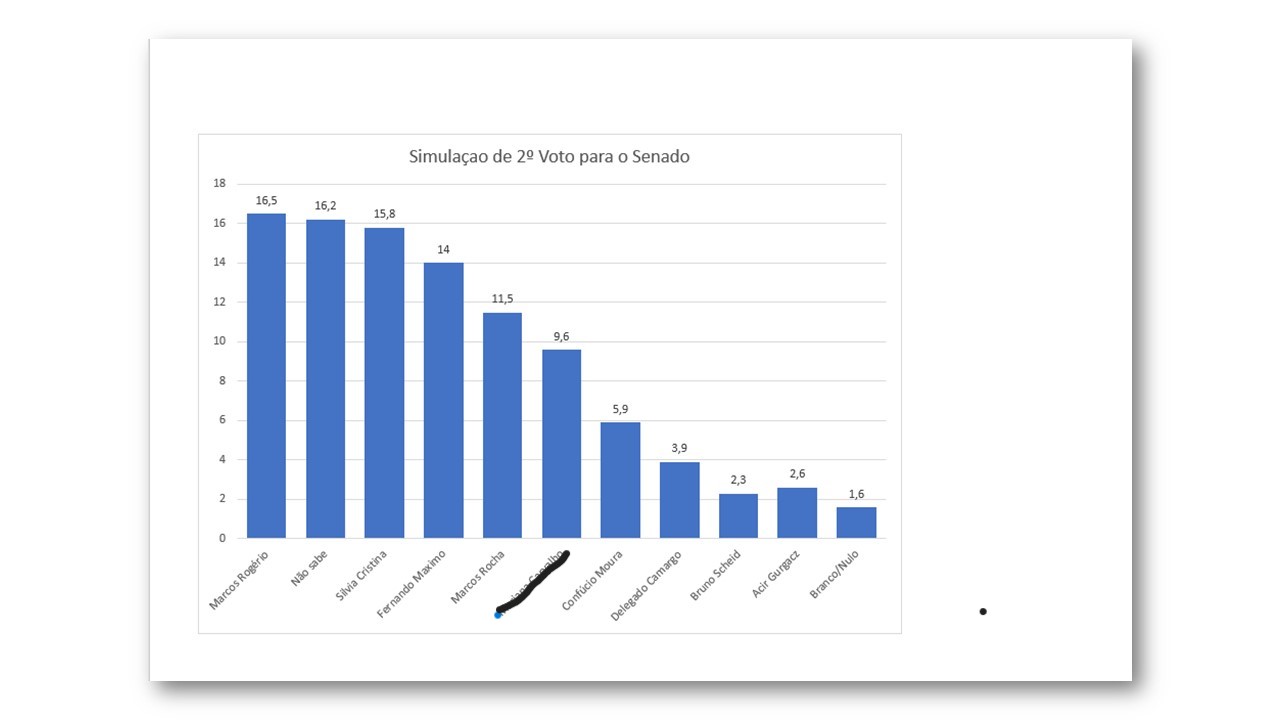 Neste cenário de segundo voto para o Senado, o atual senador Marcos Rogério (PL) liderou com 16,5% das intenções de votos, seguido por Sílvia Cristina (PP) em segundo lugar com 15,8% das intenções. O terceiro colocado foi o deputado Fernando Máximo (UB) com 14%, seguido pelo quarto colocado Marcos Rocha (UB) 11,5%. Em quinto lugar apareceu a XXXXXXX XXXXXXXX (UB) com 9,6%; em sexto com 5,9% apareceu o senador Confúcio Moura (MDB), em sétimo o deputado Delegado Camargo com 3,9%, em oitavo Bruno Scheid (PL) com 2,3%, e em último lugar o ex-senador Acir Gurgacz (PDT) com apenas 2.6%.