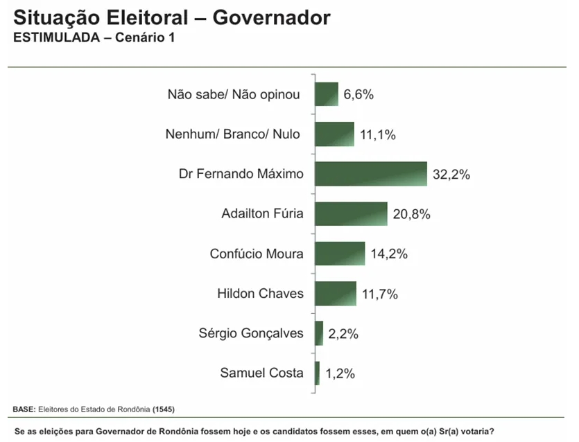 No primeiro cenário, os resultados apontam Dr. Fernando Máximo com vantagem na primeira colocação, com 32,2%, quase 12% a frente do segundo colocado, Adailton Fúria (20,8%), prefeito de Cacoal.