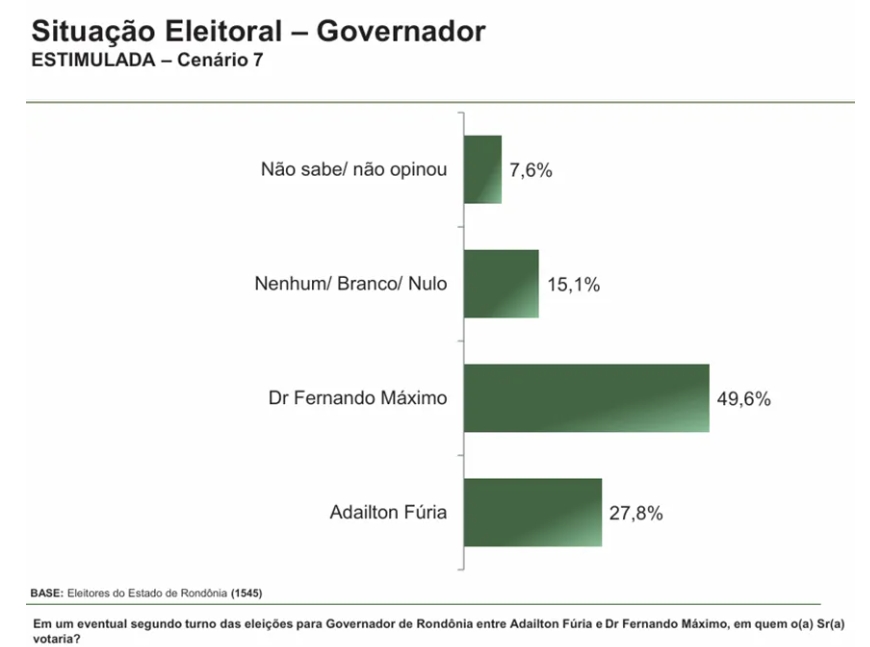Neste cenário, a pesquisa perguntou: “Em um eventual segundo turno das eleições para governador de Rondônia entre Dr. Fernando Máximo e Hildon Chaves, em quem o(a) Sr(a) votaria?”, e obteve como resultado: Máximo com 50,9% das intenções de voto, e Hildon com 21,4%.