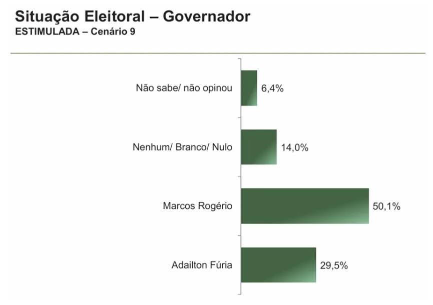O Instituto Paraná Pesquisas também quis saber em quem as pessoas votariam num eventual segundo turno para o governo do estado de Rondônia entre Marcos Rogério e Adailton Fúria. Rogério registrou 50,1%, enquanto Fúria obteve 29,5% das respostas.
