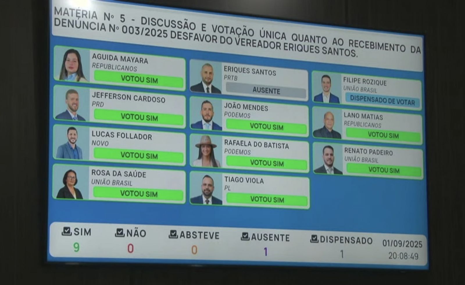 Dos 11 vereadores, 9 aprovaram o recebimento da denúncia. O presidente da Câmara é dispensado da votação e o vereador denunciado estava ausente.