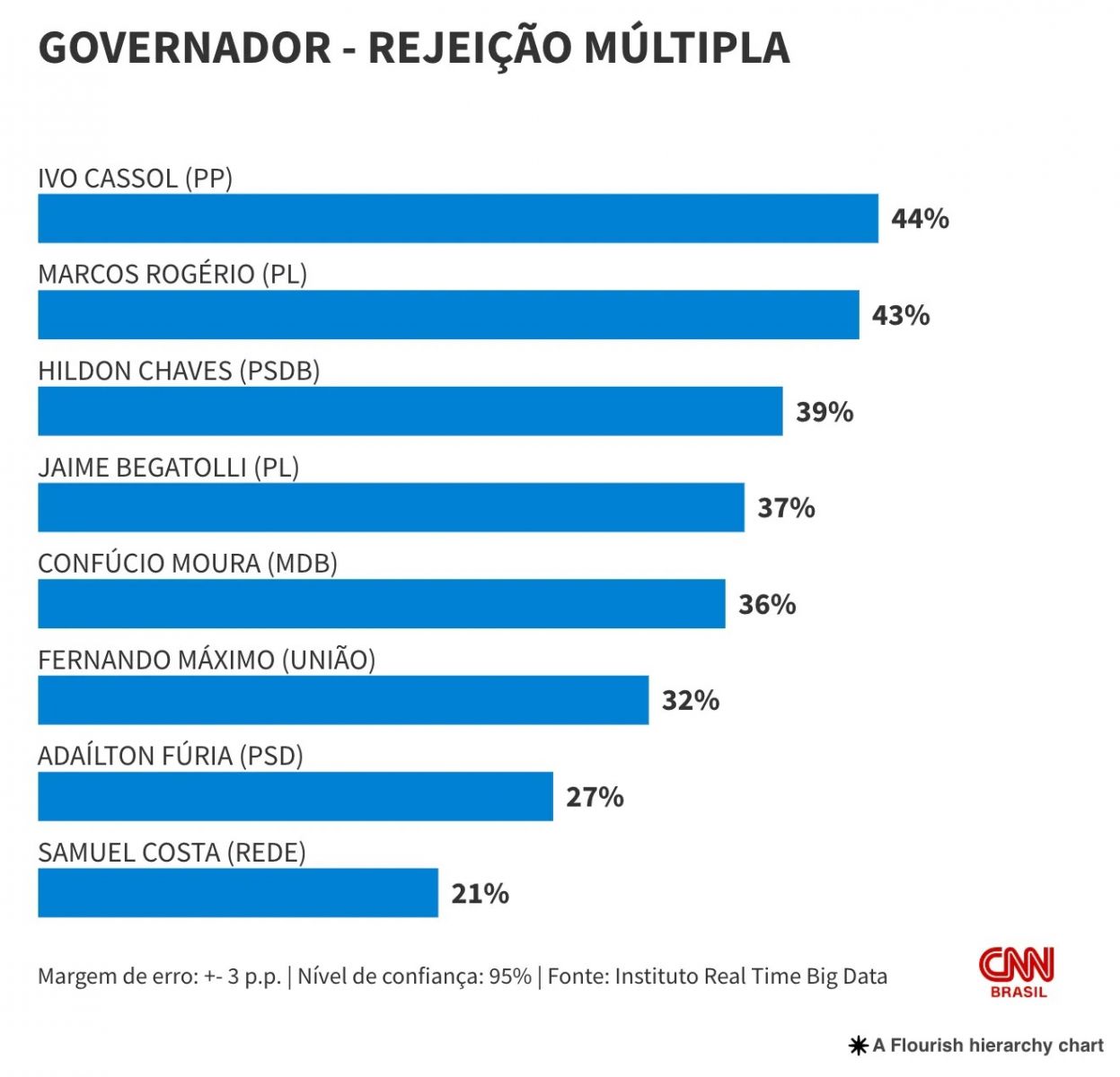 Para efeito de comparação, em outro estado, uma pesquisa recente mostrou que o senador Omar Aziz (PSD) liderava índices de rejeição — 41% — entre pré-candidatos ao governo do Amazonas.