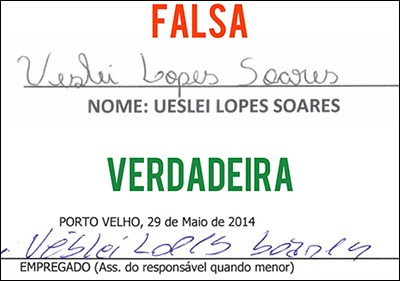 A reportagem teve acesso ao arquivo digital e a uma assinatura verdadeira de Ueslei. A comparação visual é clara: não há qualquer semelhança.