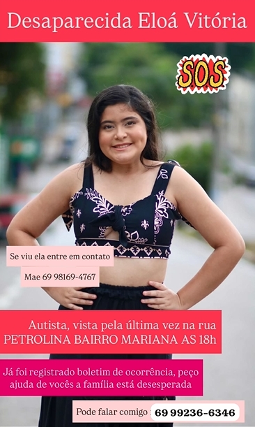 Qualquer informação sobre o paradeiro da adolescente pode ser enviada para o número 69 9 9363 4283