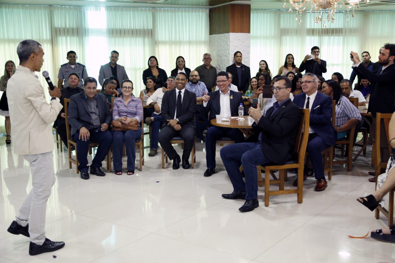 Governador Marcos Rocha, secretários e superintendentes ouvem a declamação de Márcio Poeta, no auditório Rosilda Shockness