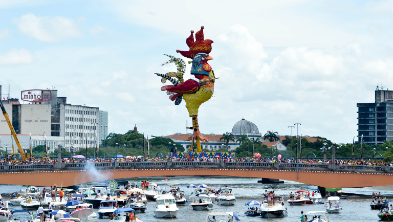 Durante o Carnaval, o famoso Galo da Madrugada é montado na Ponte Duarte Coelho. Crédito: Marcelo Lacerda/Prefeitura do Recife