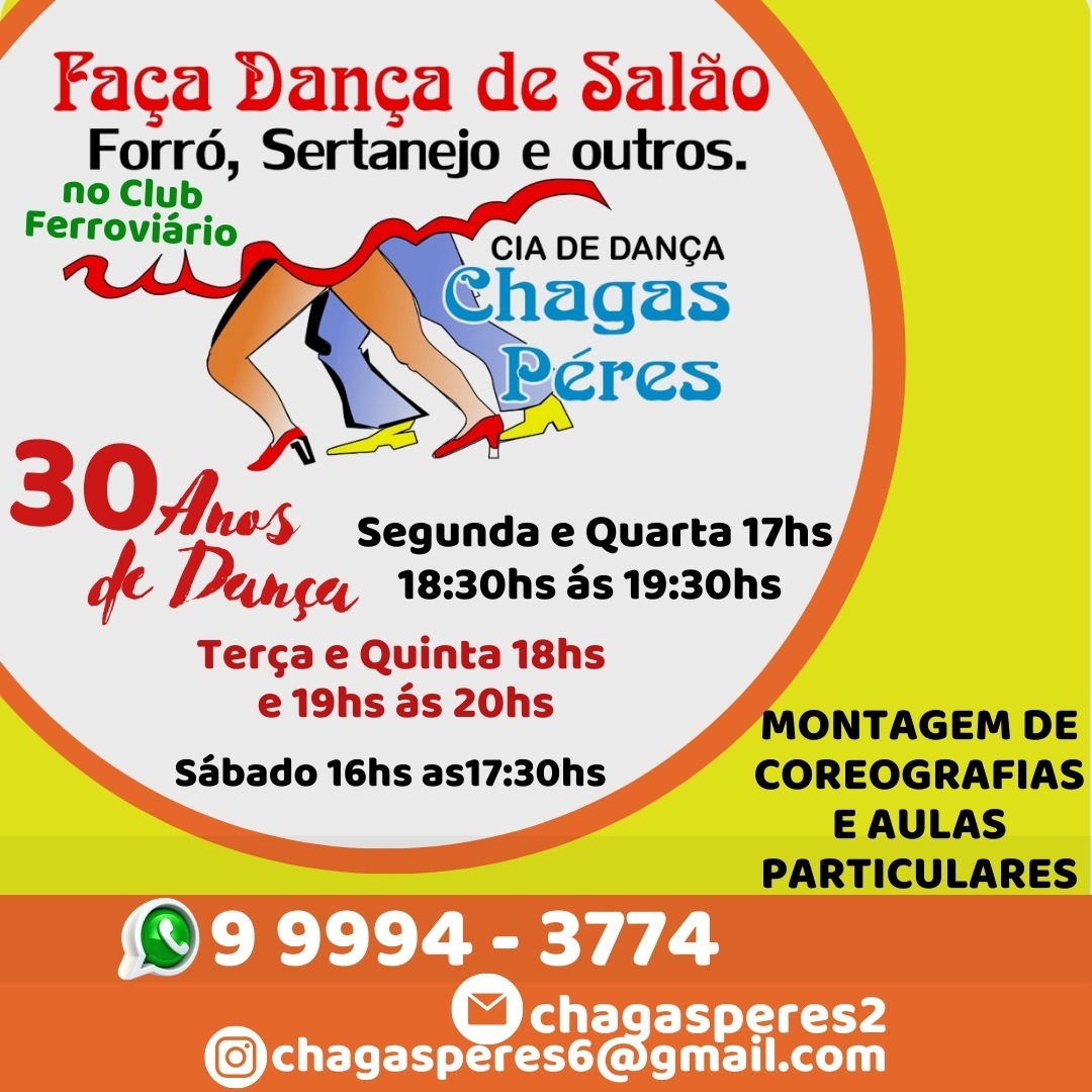 Cansou de passar vergonha por não saber dançar nada? Para que isso não ocorra mais, aprenda a dançar na Academia de Dança Chagas Peres. Aulas de segunda à quinta-feira e aos sábadso em diferentes horários, no Clube do Ferroviário, no centro de Porto Velho. Mais informações pelo telefone: 99994 – 3774(whatsapp).