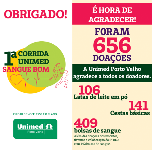 A 1ª CORRIDA SANGUE BOM, promovida pela Unimed Porto Velho, foi um sucesso! Adultos, crianças, bebês, todos participaram e vibraram com o exercício que foi além do físico, mas exercício de cidadania pelo objetivo de arrecadar para ajudar quem precisa! Aconteceu em abril e as redes sociais exibem centenas de fotografias que passarei a mostrar porque transmitem um incentivo marcante, uma alegria vibrante e a organização perfeita de quem quer realmente ajudar e fazer o melhor para nossa cidade. Confiram o resultado e as fotos maravilhosas que vão além do esporte – saúde e solidariedade!