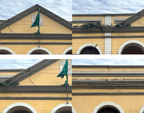 Minha maior preocupação é com as fissuras que estão espalhadas na parte externa dessa construção. Ao todo fotografei umas 12 fissuras ou mais. A solução seria fazer uma amarração por trás, sem alterar a estrutura.
