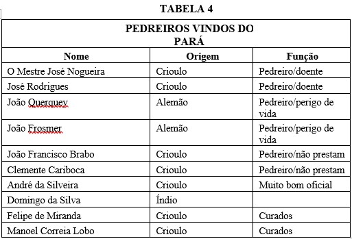 Com mais 46 negros e militares oficiais de alvenaria que chegaram do Pará, indo se juntar aos demais trabalhadores, a construção do forte ganhava um reforço que fazia toda diferença conforme (Tab. 4). Dentre os recém-chegados escravos, Sambucete faz uma ressalva ao negro Nogueira, dizendo que dentre todos os negros recém-chegados, era o melhor oficial de pedreira vindo de Macapá. Com esse destaque, Nogueira recebe o cargo de mestre de obra por merecimento e capacidade que demonstrava com a obra de El Rey.