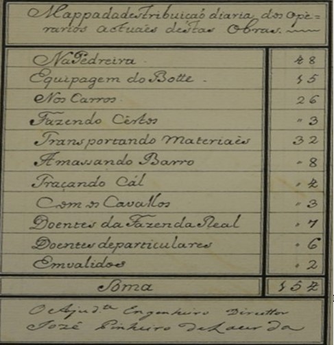 No início de cada ano, fazia-se um levantamento, uma espécie de registro de campo do quantitativo de trabalhadores que estavam operando na obra, para ter ideia da necessidade de novos trabalhadores, como aparece no registro (Fig. 22) de 2 de março de 1780, da carta enviada pelo Capitão Engenheiro José Pinheiro de Lacerda ao governador Luiz de Albuquerque mostrando a seguinte relação de trabalhadores: