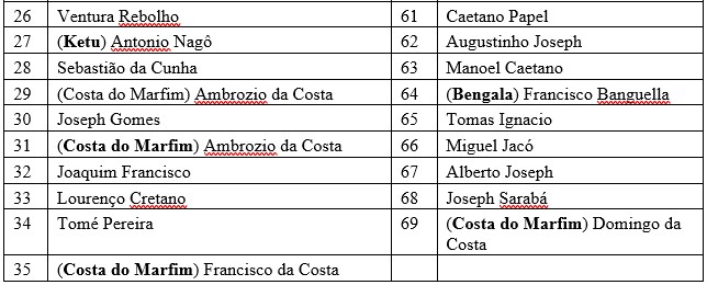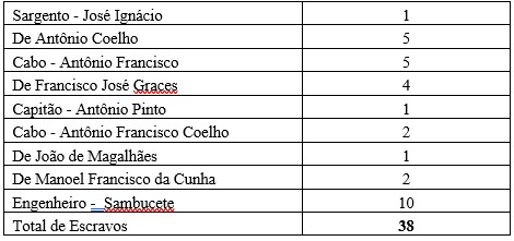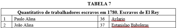 Como podemos observar (Tab. 7) nem todos os trabalhadores relacionados num total de 69 apresentam sobrenome indicando a origem e o local de onde vieram já outros tem o sobrenome de seu dono, os demais deixam uma lacuna quanto a sua origem. Esses escravos eram deslocados das cidades de Belém, Rio de janeiro, Cuiabá e São Paulo para reforçar o contingente de trabalhadores que estavam inseridos na construção do forte.