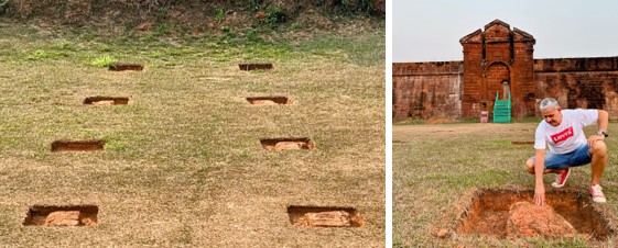 As áreas que estão sendo escavadas são: lado direito da entrada principal entre as residências que dão acesso ao baluarte de Santa Bárbara e o lado esquerdo entre as residências que dão acessos ao baluarte de Santo Antônio de Pádua.