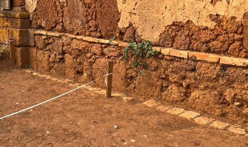 Na escavação que está sendo realizada próxima as residências, nota-se a presença de um nivelamento com tijolos maciço frontal, servindo como nível para as camadas superiores, ou seja, as paredes. 40 centímetros acima, temos um outro tipo de nivelamento com os mesmos tijolos, porém estão posicionados de lado.