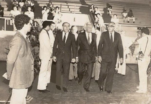 F. Teixeira (d) chega para a promulgação com os ministros Andreazza (c) Andreazza (e). Foto Marcos Grutzmacher/ALE.