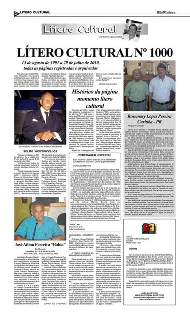 O Sr. Euro foi o maior incentivador da página semanal Momento Lítero Cultural (15 de agosto de 1991 a 5 de julho de 2012 – 1115 páginas históricas), editada pelos poetas Selmo Vasconcellos e saudoso José Ailton Ferreira “Bahia” e os nossos queridos amigos e editores de cultura Marcos Gomes e José de Holanda (Zezinho)