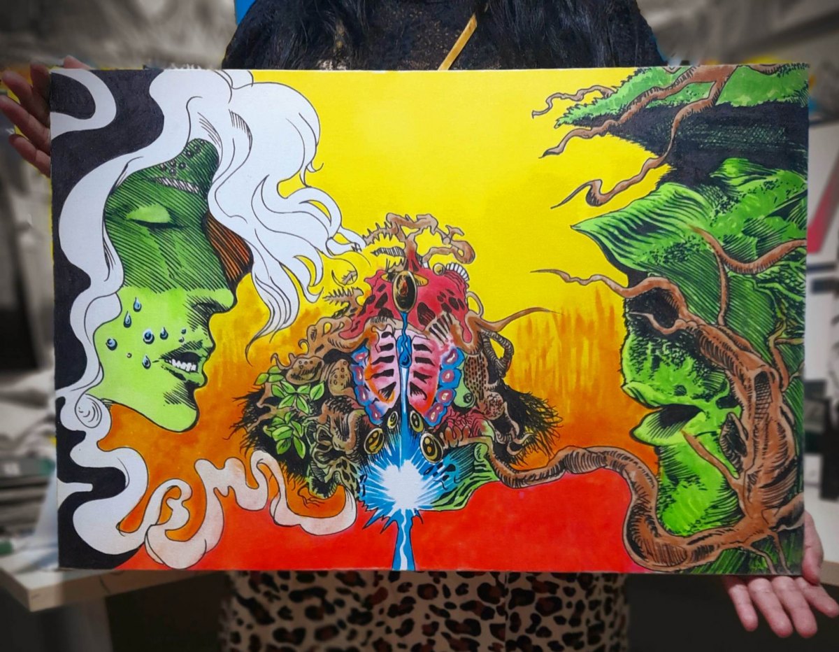 Hoje em dia, minha Companheira e eu pintamos Telas e Camisetas em casa mesmo. Essa junção de atividades ocorreu naturalmente. Recebemos pedidos, fazemos e entregamos encomendas de amigos clientes que nos ajudam e apoiam, como forma de aumentar a renda e continuar realizando esse sonho acordado de Arte. Nosso trabalho até o momento é totalmente Artesanal e gostamos muito de sermos artesãos. Eu sou mais ligado ao desenho e Ela mais íntima da Pintura.