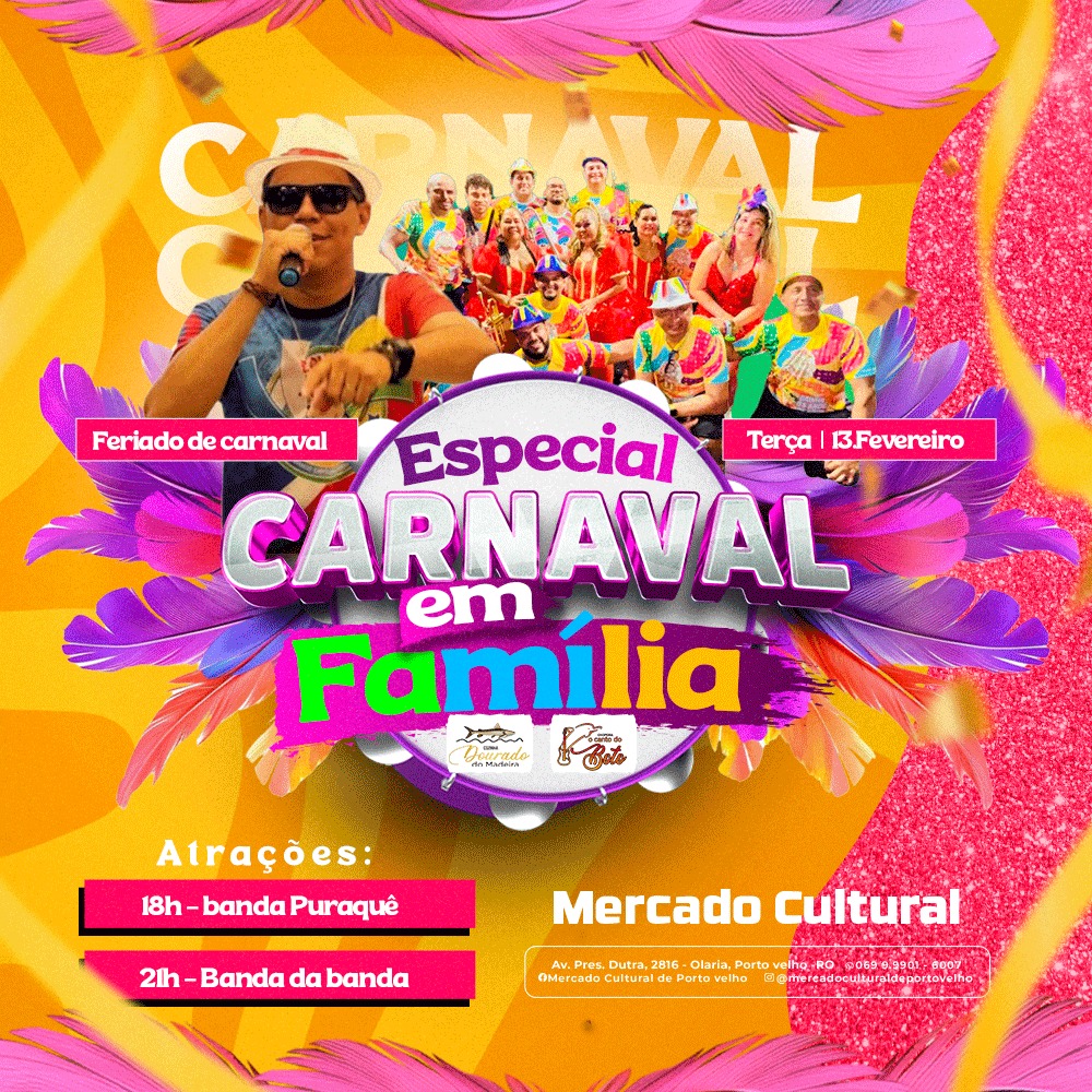 Nesta terça-feira, dia 13, a quarta e última noite do 'Carnaval da Família' realizado no Mercado Cultural de Porto Velho, vai rolar muito frevo, axé music e marchinha a partir das 18h, com show da banda Puraquê, que arrastou os brincantes do tradicional bloco Pirarucu do Madeira, em seguida, às 21h, show da Banda da Banda, responsável por "arrastar" milhares de foliões no maior bloco de carnaval de rua da região Norte, a Banda do Vai Quem Quer.