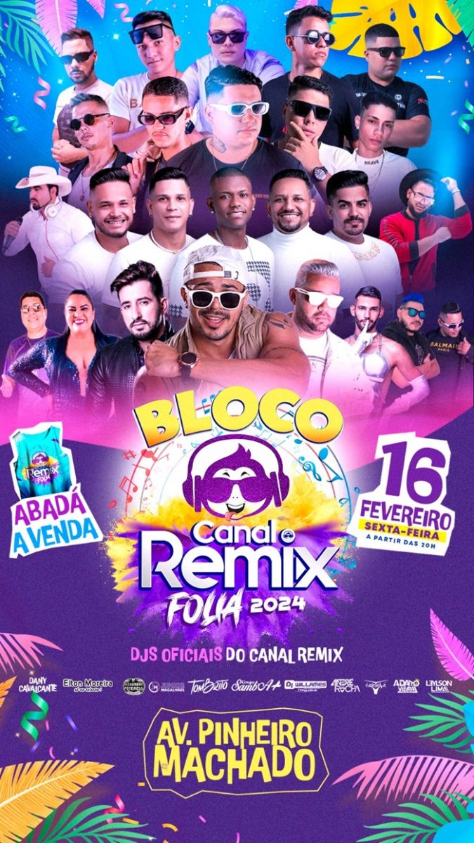 Quando o assunto é inovação, o Canal Remix Folia vem para fazer a diferença. A proposta é levar para o Circuito da Pinheiro Machado, dia 16 de fevereiro (uma sexta-feira), uma animação que atenda a todas as espécies de público, indo do forró, ao pagode e o sertanejo sempre com a organização e a segurança de sempre, levando jovens e adultos no ritmo de uma verdadeira ´balada carnavalesca´.