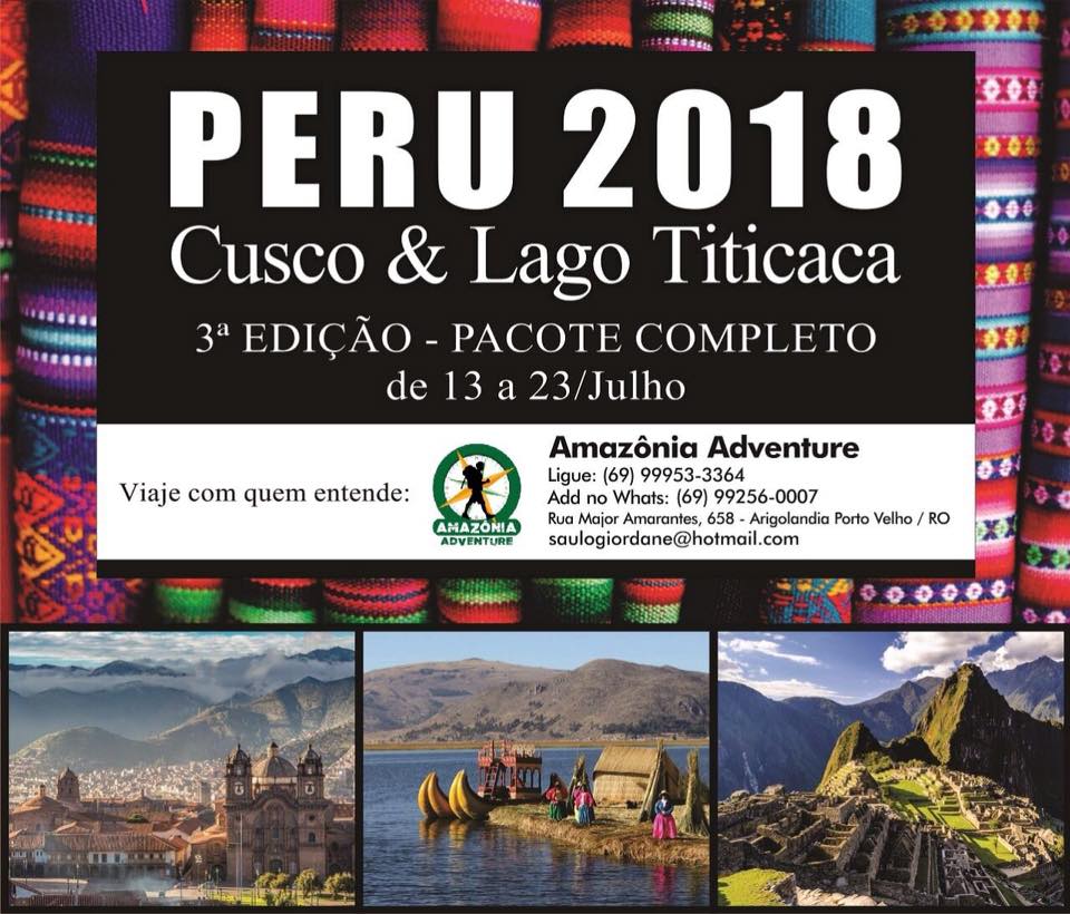 Quatro Agências de Turismo de Porto Velho estão promovendo pela terceira vez nova Excursão terrestre para Cuzco, Vale Sagrado, Puno “Lago Titicaca” e Machu Pichu*, com saída dia 13 e retorno 23 de julho. Serão 10 dias na terra dos Incas. Essa viagem é promovida pelas Agências M&A Turismo, Madeira Turismo, Ilta Turismo e Amazônia Adventure. “As pessoas irão conhecer uma das regiões mais lindas do Peru”, afirma o turismólogo, Saulo Giordane, um dos coordenadores da excursão, que já levou vários Grupos para conhecer essa região nobre do Peru.